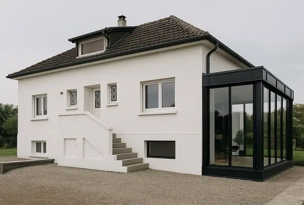 Nous réalisons la conception architecturale et la maîtrise d’œuvre pour des extensions vitrées contemporaines, des vérandas à ossature aluminium et des rénovations de façade. L’intervention porte sur la création d’un volume vitré noir intégré à une maison au parement blanc, l’adaptation des ouvertures existantes, la mise en place d’un soubassement isolé, le traitement des points de jonction avec la toiture en tuiles et l’intégration d’un escalier d’accès extérieur. En tant que prestataire architecture résidentielle, nous proposons une prestation complète : esquisses, plans d’exécution, demande de permis de construire si nécessaire, consultation technique pour le choix des menuiseries et du vitrage, puis coordination des artisans sur chantier pour un rendu propre et conforme aux attentes. Chaque solution est pensée pour optimiser l’apport lumineux, la performance thermique et l’esthétique contemporaine, tout en respectant les contraintes budgétaires et urbanistiques locales.