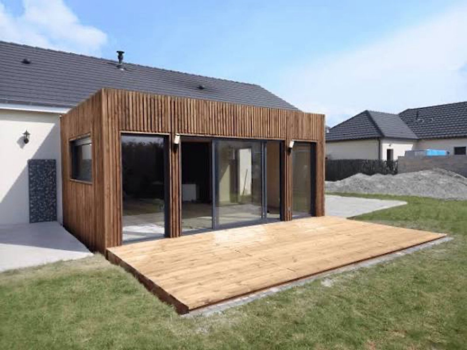 Nous utilisons des familles de matériaux et équipements éprouvés et adaptables : ossature bois, bardage bois vertical ou horizontal, isolants thermiques classiques, baies vitrées coulissantes en aluminium ou PVC, lames de terrasse en bois ou composite, systèmes d’étanchéité et finitions intérieures (plâtrerie, peinture, revêtements de sol). Les choix sont présentés selon durabilité, entretien et budget afin de définir la meilleure solution pour votre projet.